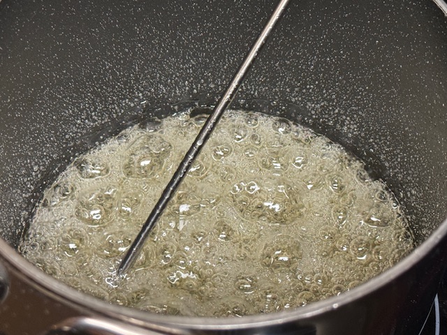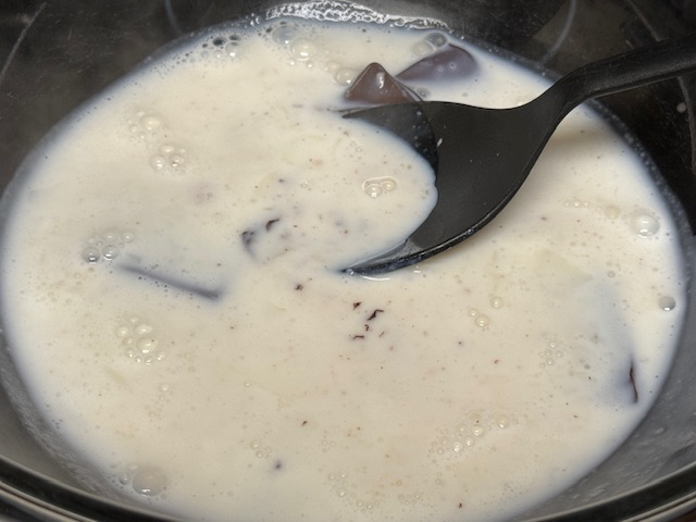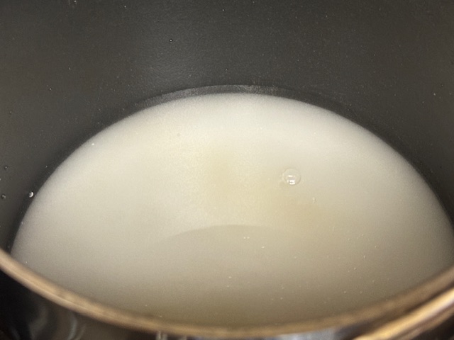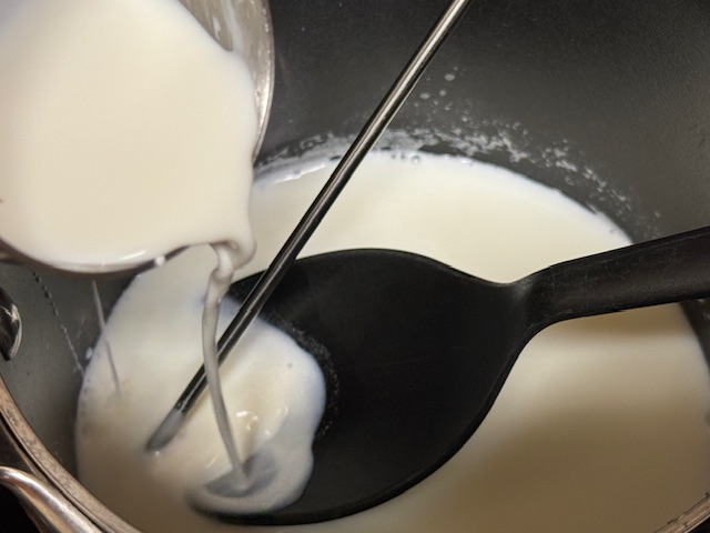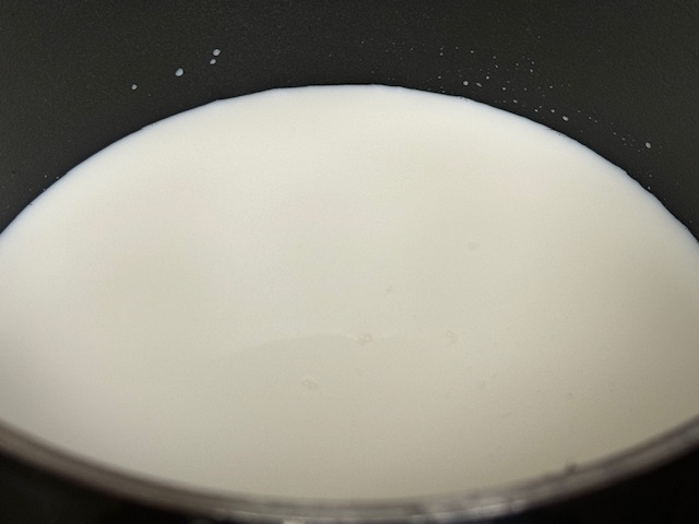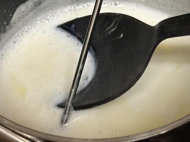 1. Faire chauffer les 300 grammes de lait avec le sirop de glucose. Une fois 85°C est atteint, y verser le lait avec la maïzena. Porter à ébullition.