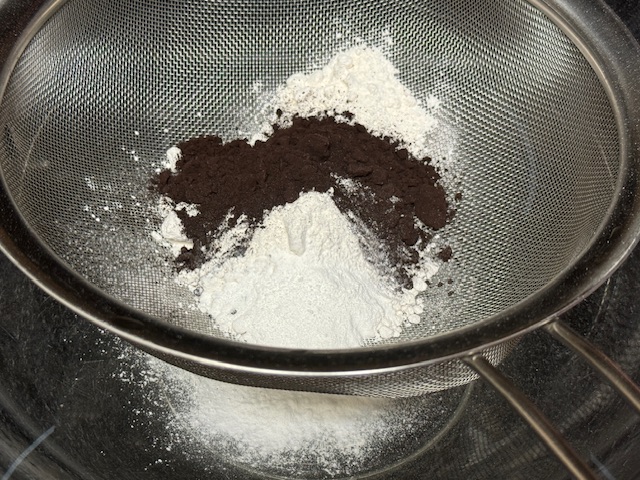 1. Dans un saladier, tamiser la farine avec la poudre de cacao et la levure chimique. Puis tamiser la poudre d’amande au-dessus et mélanger avec une cuillère.