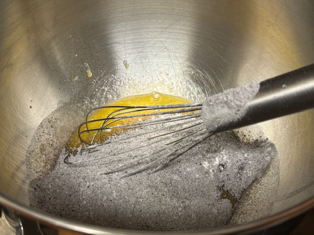 1. Dans un autre bol, fouetter (à la main) les œufs avec le sucre. Y ajouter les poudres et tout mélanger.