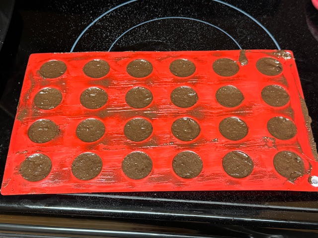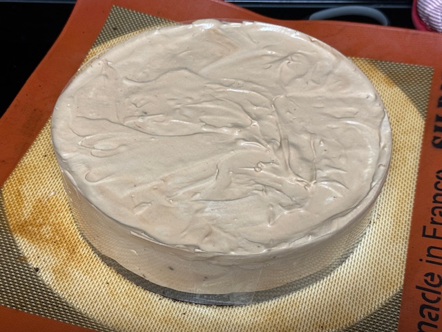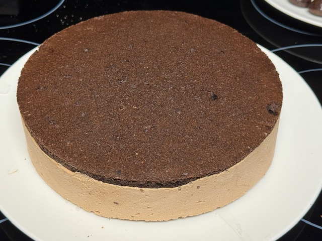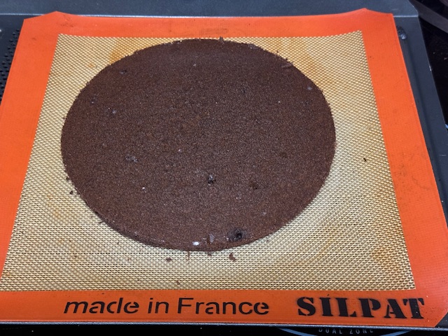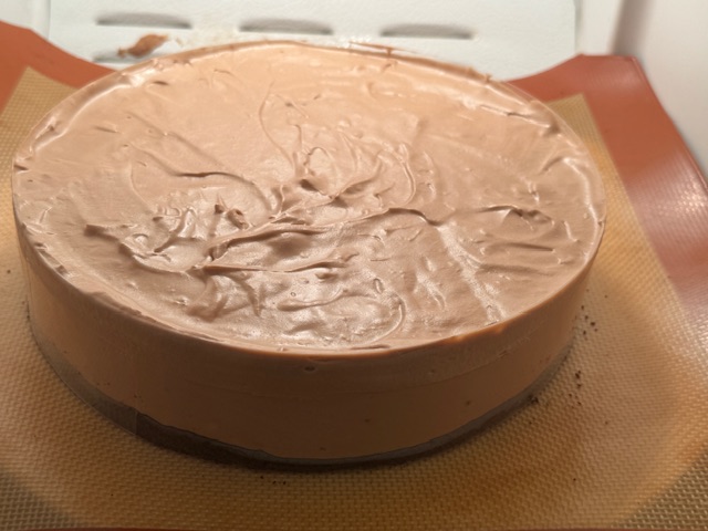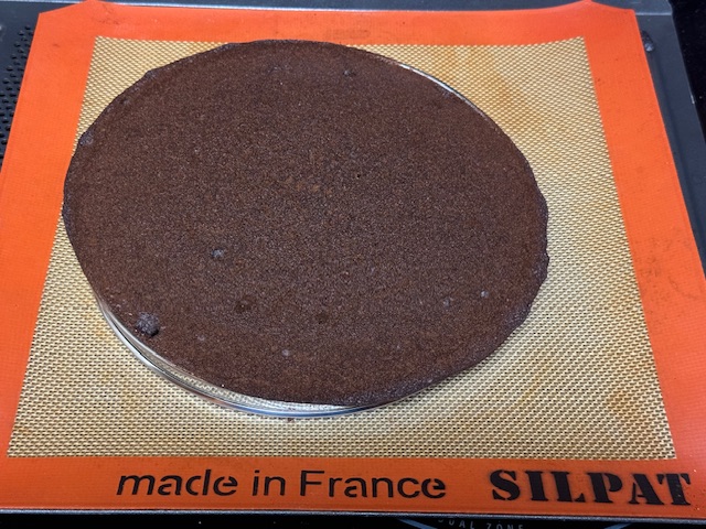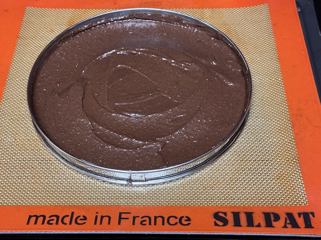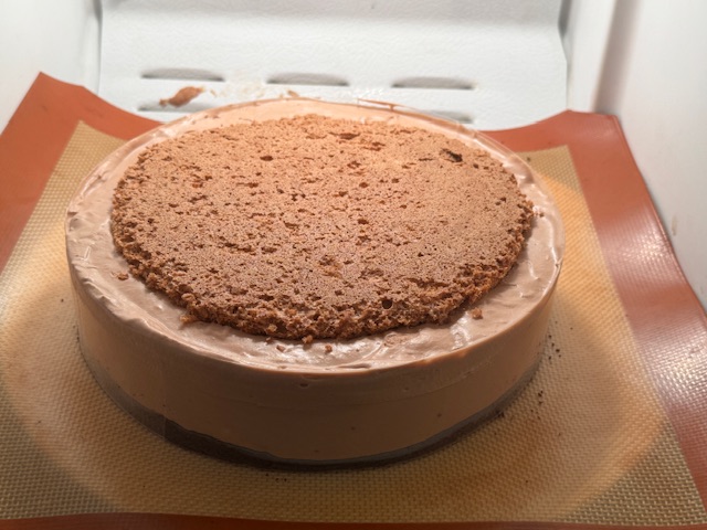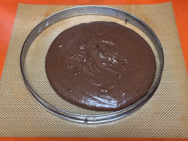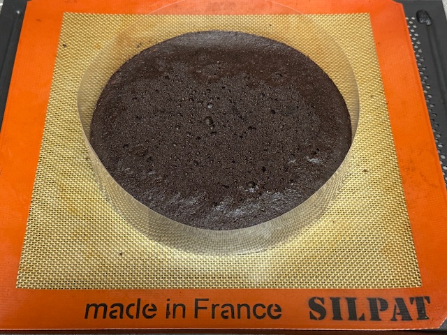 1. Mettre le biscuit au chocolat à l’envers sur un tapis en silicone. Entourer avec du Verser la mousse au-dessus et égaliser avec une maryse.