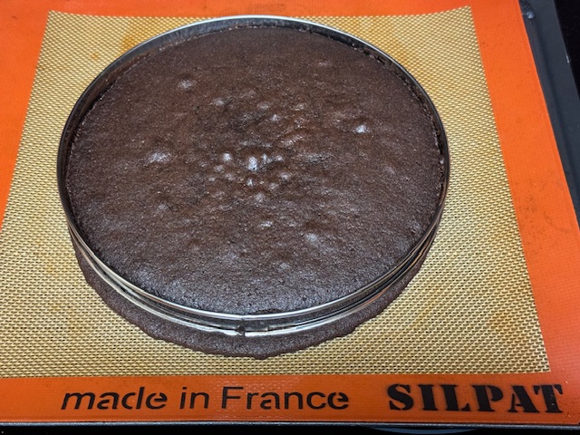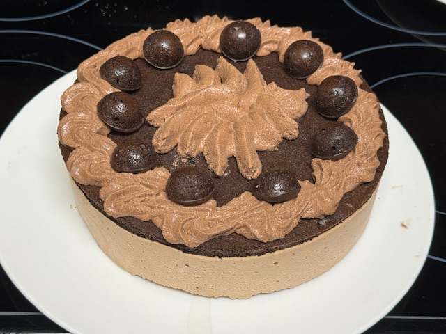 Le gâteau en bas à gauche a attiré notre attention. (J’aurais aimé essayer celui en haut à gauche, mais je ne sais pas faire une roulade ovale.) Je me suis dit, « Ceci est plus un entremets qu’un gâteau, comment vais-je tout faire ? » J’ai enfin décidé que la mousse serait celle de ma bûche de Noël « Riviera », car elle a la bonne structure. J’ai recherché d’autres entremets pour trouver un bon biscuit au chocolat ; j’ai trouvé celui-ci chez Gâteau et Cuisine Rachida (attention, il y a un changement en bas). Il y a une dacquoise au fond pour la base ; ça vient du livre de Gaston Lenôtre. Finalement, je voulais une ganache montée pour décorer le dessus ; j’ai utilisé une recette du site de Valrhona, mais je chercherai une autre quand Mme Zenatti m’appellera.