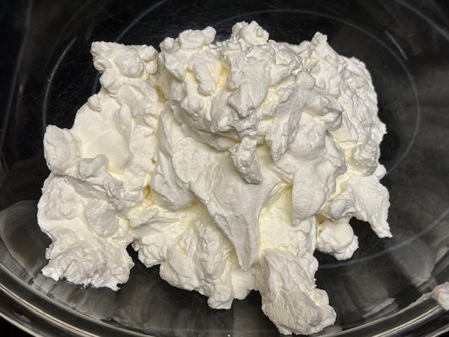 2. Fouetter bien la crème liquide jusqu’à ce qu’elle devienne une crème chantilly. Mettre la crème dans un saladier et réserver au frigo.