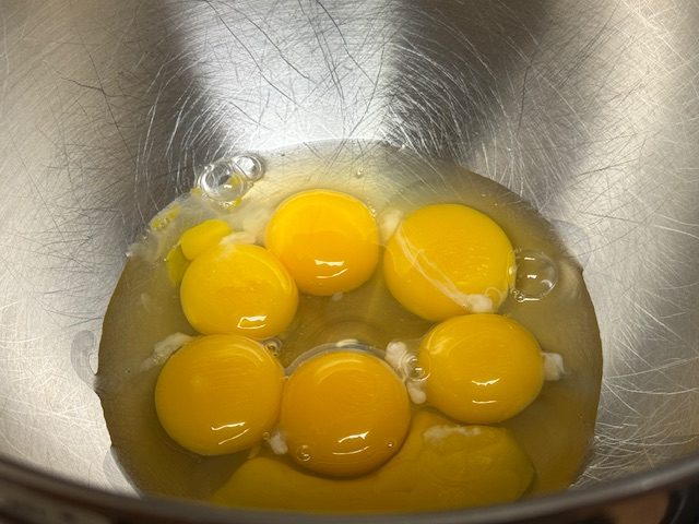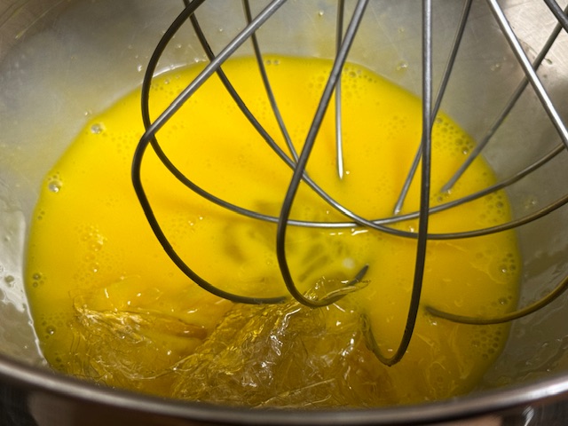 1. Dans le bol de votre robot, fouetter l’oeuf entier et les jaunes. Ajouter les feuilles de gélatine pressées.