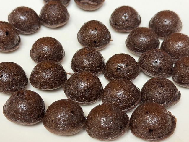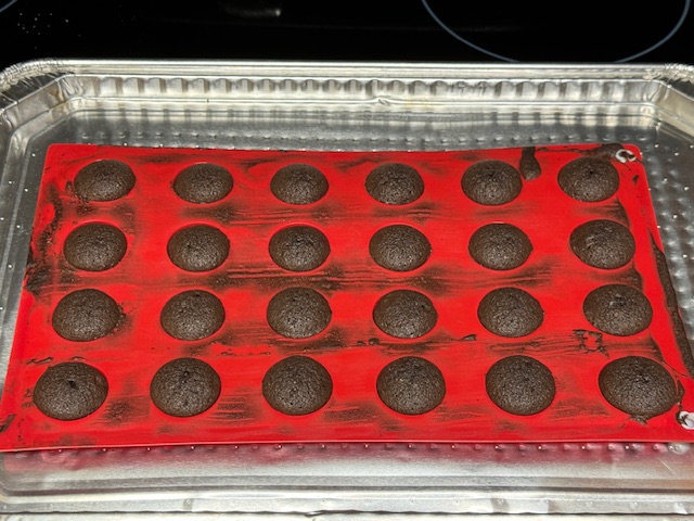 À noter ; il y a des demi-sphères en haut pour décorer mon gâteau. J’ai fait un deuxième lot de cette recette, puis l’ai enfourné dans le bon moule. Il y a des cubes de quelque chose au chocolat dans la photo originale ; c’était mon effort pour tout dupliquer sans avoir le bon moule.