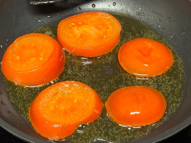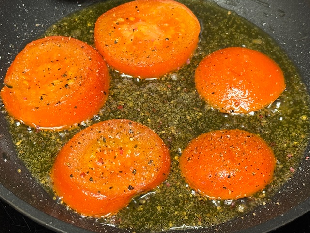 1. Chauffer de l’huile d’olive dans une poêle. Y faire revenir les tomates aux deux côtés. Les miennes étant plutôt juteuses, j’ai eu besoin de 3 minutes le côté sur un feu moyen.