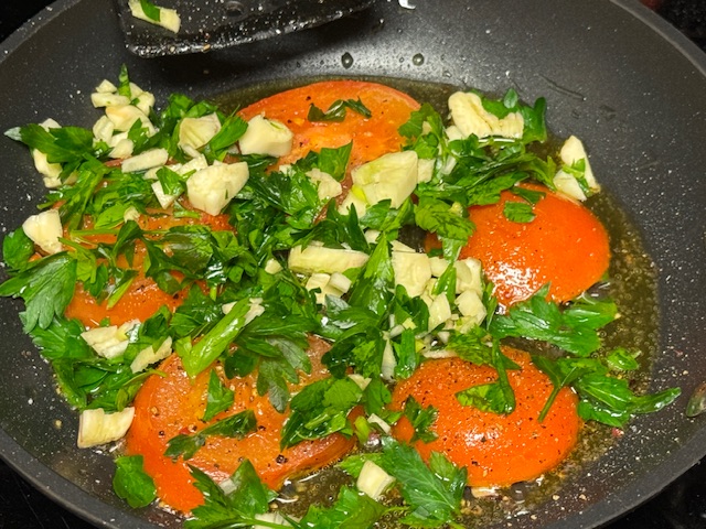 1. Saler et poivrer les tomates. La recette originale ne demande que du sel, mais c’est invisible dans les photos, alors j’ai ajouté du poivre juste pour l’effet. (À vous de décider si je plaisante, mais je dis la vérité sur la recette originale.) Y verser le mélange persil-ail et faire cuire pendant une minute.