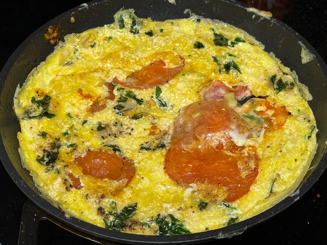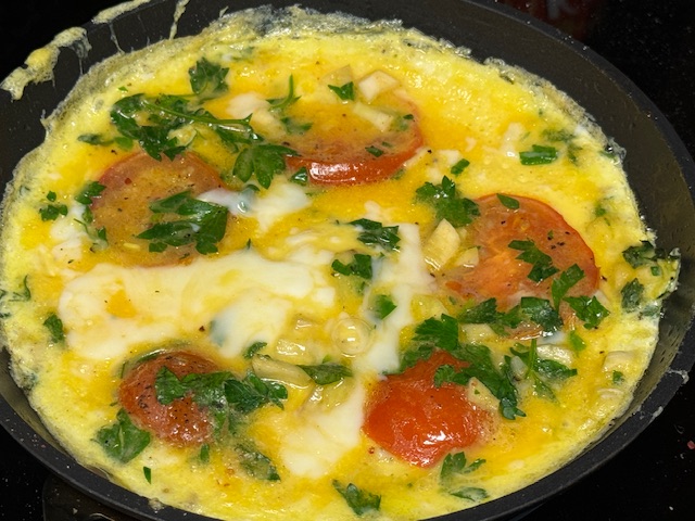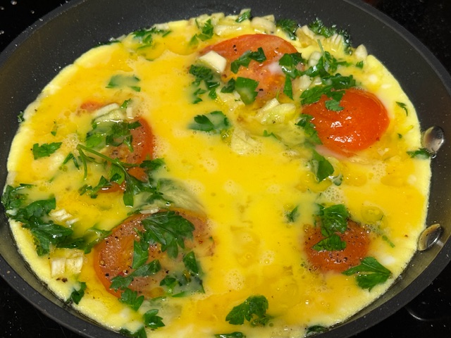 En toute modestie, je fais l’omelette à la tomate (à la saison ici, à partir de juin, car je n’aime pas les tomates qui poussent sous serre…). Par contre, je coupe mes tomates en petits morceaux avec thym, persil ou coriandre. J’apprécie la cuisine provençale moi aussi !