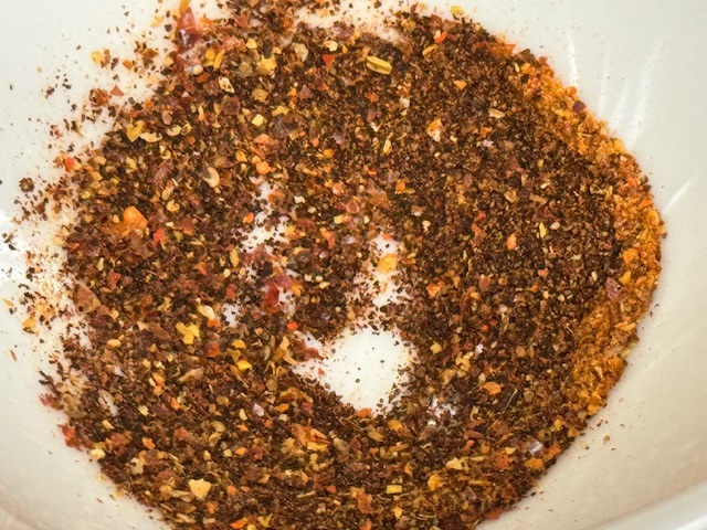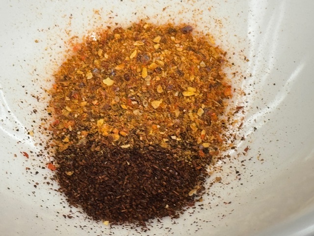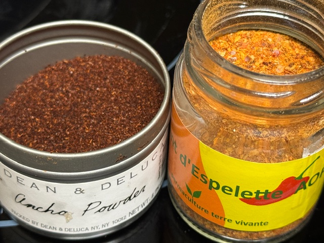 1. À la fin, saupoudrer avec le cumin et le piment d’Espelette. Au lieu de cumin, j’ai utilisé un peu de poudre d’ancho, un piment du Mexique et de Californie. C’est aussi épicé que le cumin, ce que je ne garde pas sous la main.