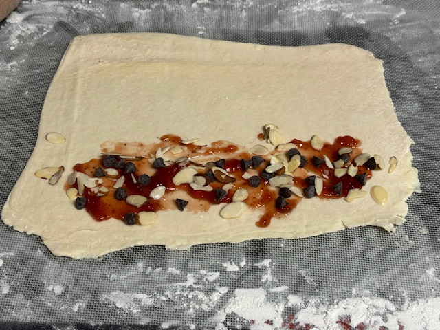 1. Étaler de la confiture de fraise sur la moitié de la pâte. Parsemer avec des pépites de chocolat et des amandes effilées.