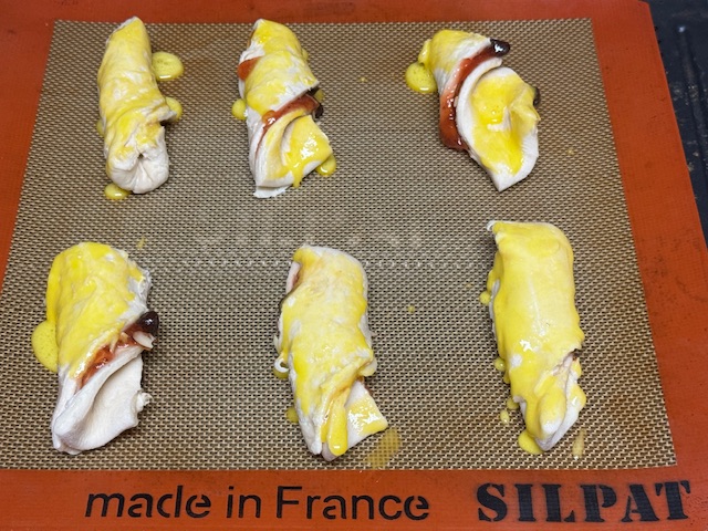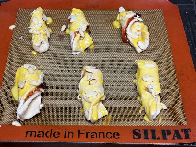1. Badigeonner les sacristains avec le jaune d’œuf. Parsemer avec plus d’amandes effilées puis appuyer légèrement sur les amandes pour les faire coller.