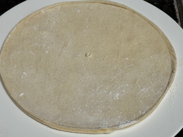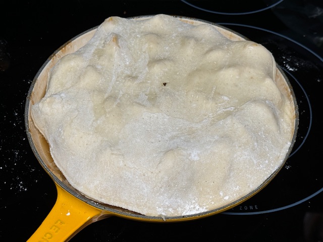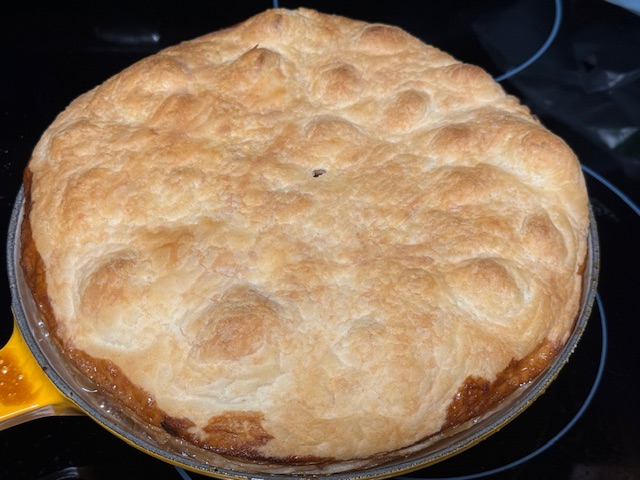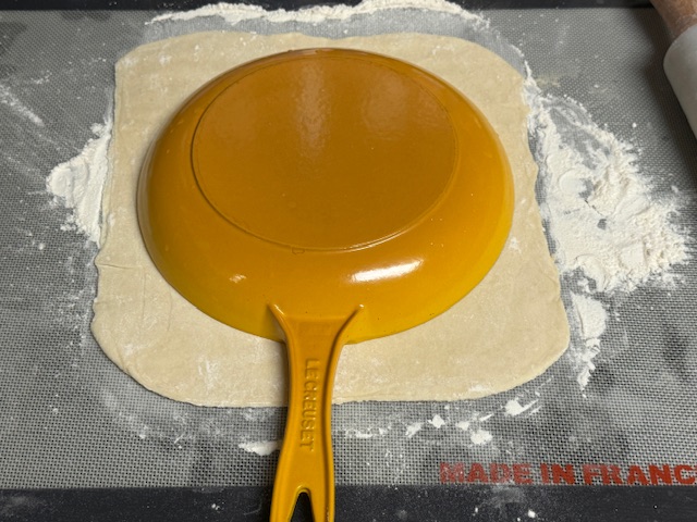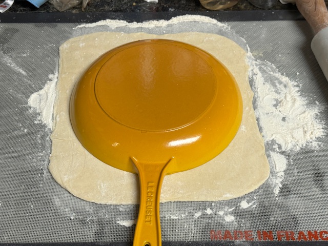 J’ai fait plutôt exactement la bonne quantité de pâte feuilletée, la moitié de ma recette habituelle. Vous allez voir que 10 % de plus aurait été le bienvenu. On est censé utiliser sa poêle pour couper un cercle encore plus large que la poêle, et je l’ai fait, mais…vous verrez.