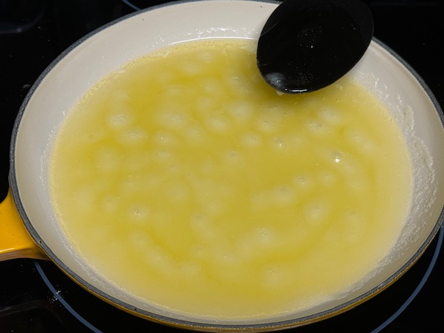 Mais après 20 minutes, le mélange beurre-sucre n’a pas vraiment devenu un caramel. Je l’ai donné 10 minutes de plus, puis j’ai dû mettre la poêle dans le four.