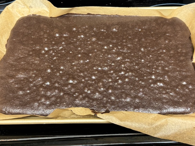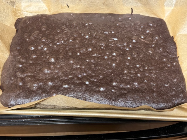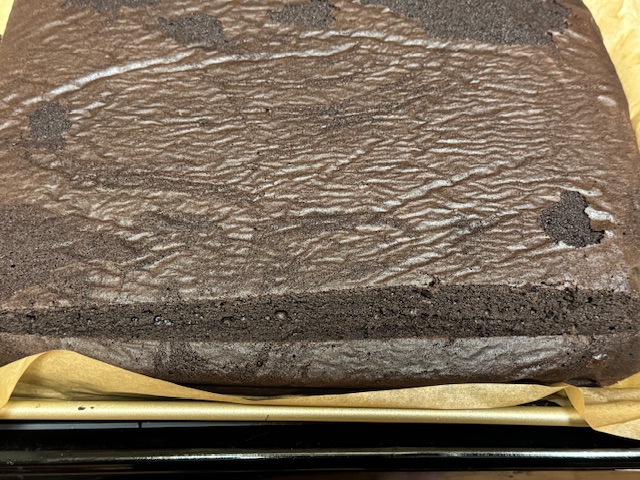 Mais je ne voulais pas faire exactement la forêt-noire du Tour. Cette fois-là, j’ai suivi la recette de Cook&Record, et si je suis honnête, je n’étais pas complètement satisfait avec la génoise, l’ayant trouvée trop dense. J’ai donc décidé de la remplacer par celle de Gaston Lenôtre, mais avec de la poudre de cacao, pas nature comme au lien. Sans publier toutes les photos des étapes — car j’ai découvert qu’il ne faut pas arrêter pour prendre des photos si on veut réussir cette génoise, j’ai appris qu’il ne faut pas le suivre exactement. Lenôtre était un génie, et moi, je suis juste un type inconnu, mais il dit de battre ses œufs pendant 23 minutes, les 15 dernières à petite vitesse. Vous savez ce qui arrive pendant ces 15 minutes ? Les œufs perdent tout leur air ! Voici mes 3 couches de génoise, chacune préparée séparément — la première est plus plate et dense que les autres, pourtant aussi gonflée de mauvaise façon, car je ne l’avais pas compris :