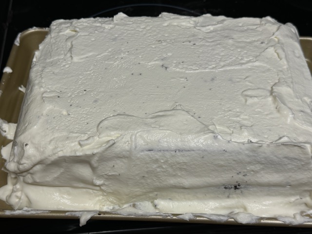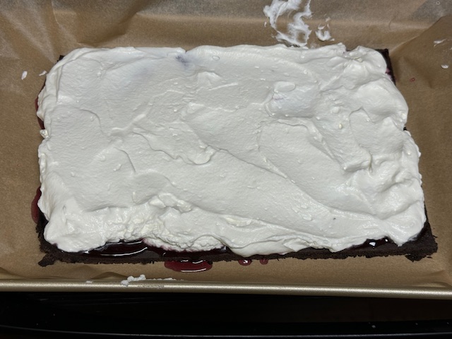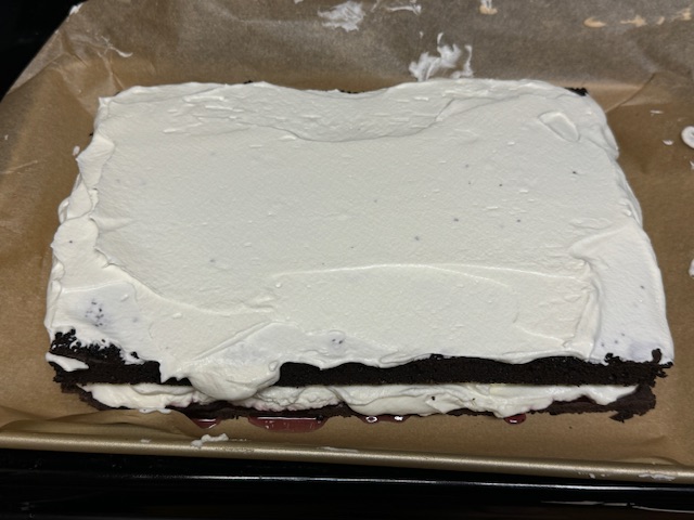 Pour la Fête nationale, l’OCA accueille un pique-nique où tout le monde doit apporter soit un plat salé soit un dessert. Honnêtement, personne ne veut que je fasse un plat salé — je peux, bien sûr, mais j’ai une réputation pour les desserts. Et pour le pique-nique, avec une cinquantaine de personnes, j’ai dû faire quelque chose à grand format. J’ai donc décidé de revisiter ma forêt-noire, mais comme je vous ai dit à l’époque, il me fallait utiliser des cerises sucrées, pas fraîches.