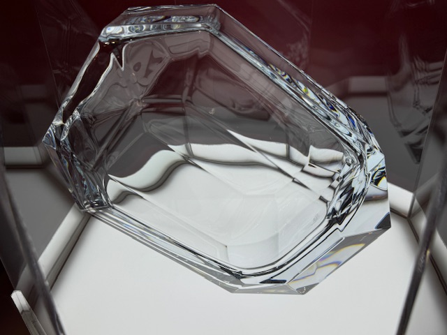 On entre à droite, et il y a trois chambres. La première, en forme de la lettre « L », montre certains de leurs produits les meilleurs connus. En arrière, il y a une chambre avec des projecteurs, qui montre un court-métrage (environ 5 minutes) sur les ateliers de Baccarat. Finalement, la chambre toute à gauche contient de nouveaux produits disponibles uniquement à South Coast Plaza en ce moment, même pas en France. Mais c’est selon une vendeuse, alors qui sait vraiment ?