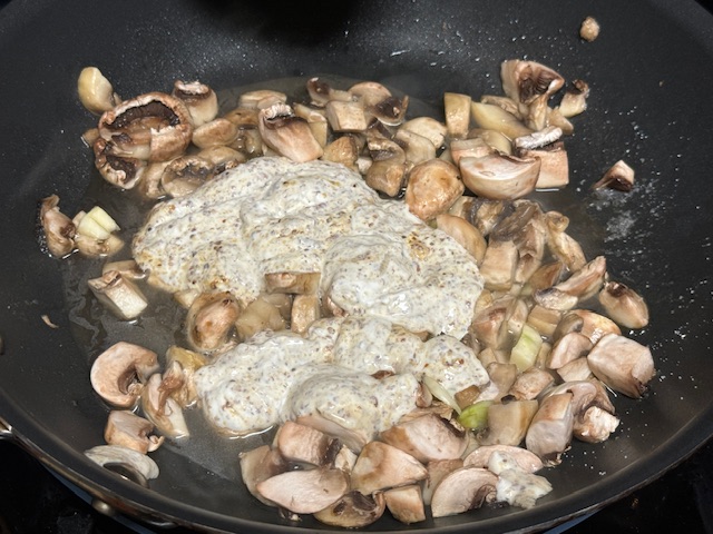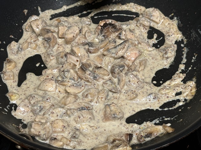 1. Après 1-2 minutes, ajouter aussi la crème fraîche et la moutarde (je les ai mélangées d’abord). Laisser mijoter jusqu’à ce que la sauce se réduit par 1/3.