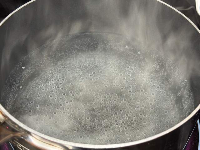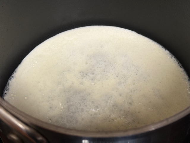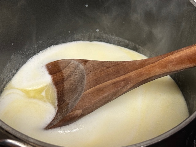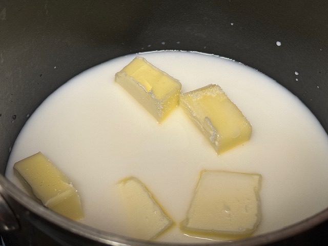 1. Dans une casserole, mettre l’eau, le lait, le sel, le sucre, et le beurre. Faire chauffer jusqu’au point de bouillir (de vapeur et de premières bulles).
