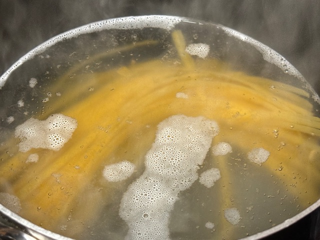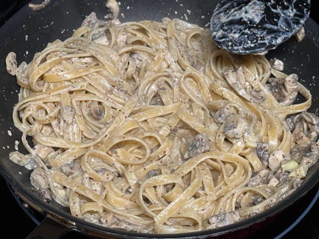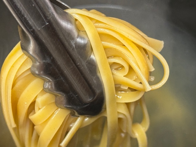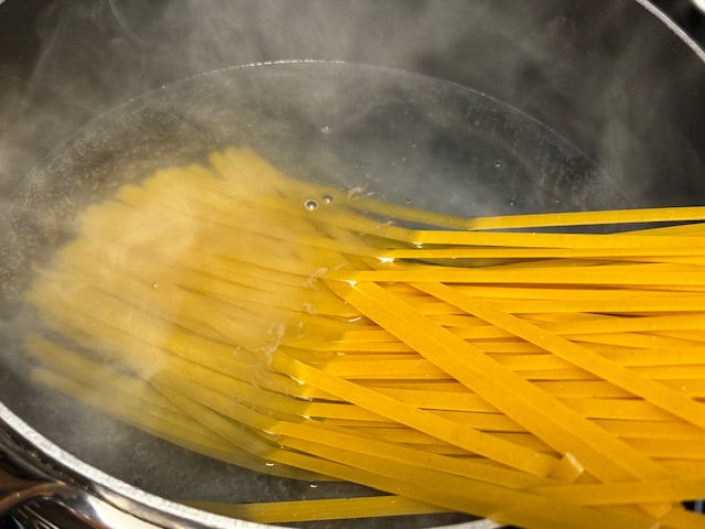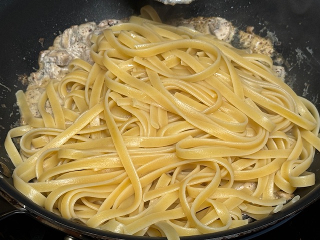 1. Préparer les tagliatelles (j’ai dû utiliser des fettuccines) selon leurs instructions, mais terminer la cuisson 2 minutes à l’avance, car on les finira dans la sauce.