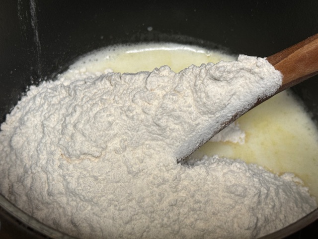 1. Retirer la casserole du feu et ajouter toute la farine à une seule fois. Remuer avec une cuillère en bois jusqu’à ce que la pâte se ramasse complètement et ne colle plus aux bords. Baisser le feu, y retourner la casserole. Faire cuire pendant 1 minute de plus pour bien sécher la pâte.