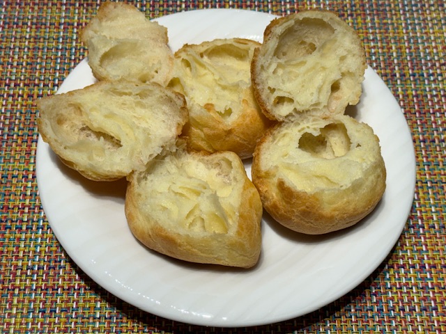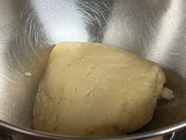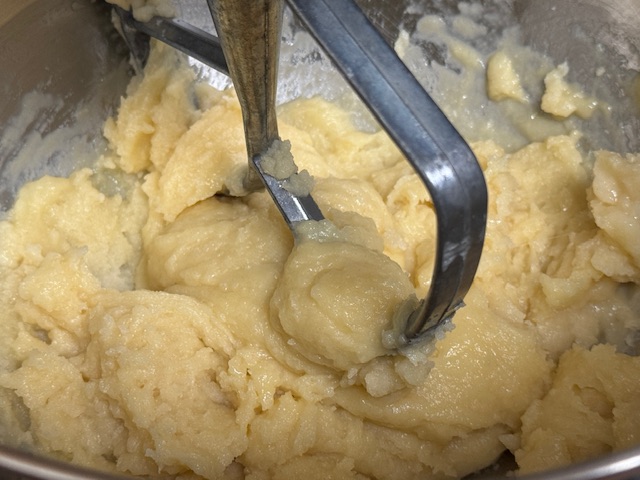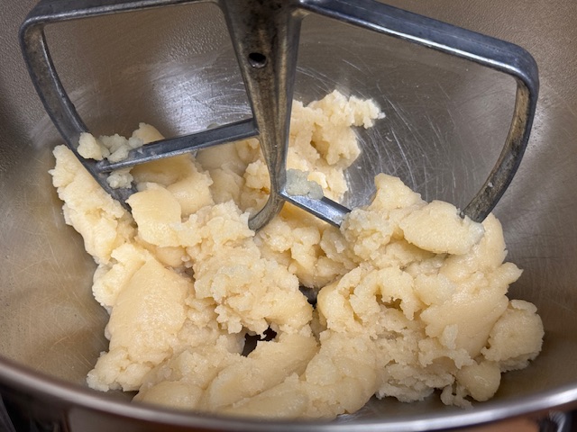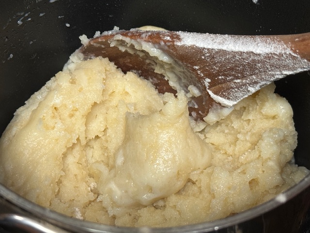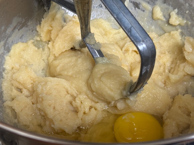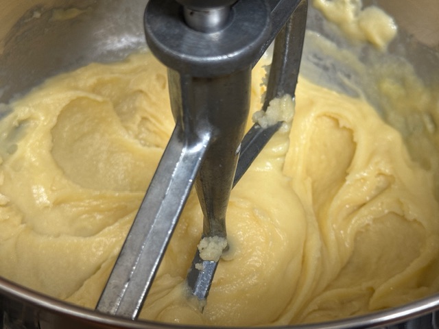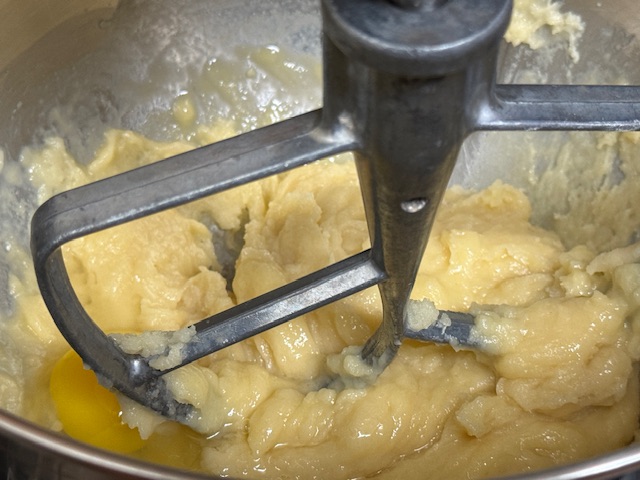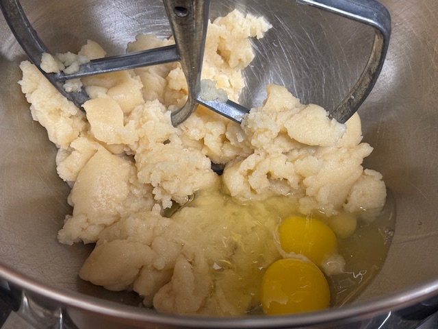 1. Transférer la pâte au bol d’un robot équipé de la feuille. Mélanger 1 minute afin de baisser la température. Ajouter 2 œufs et mélanger bien. Répéter. Si la pâte est lisse et sans grumeaux, on est prêt. Sinon, ajouter un œuf de plus et mélanger, mais 5 œufs est la limite. J’ai utilisé 4 œufs, mais j’en ai pensé à 3, car même avec 4, la pâte tombe plus que désirée.