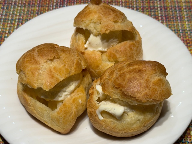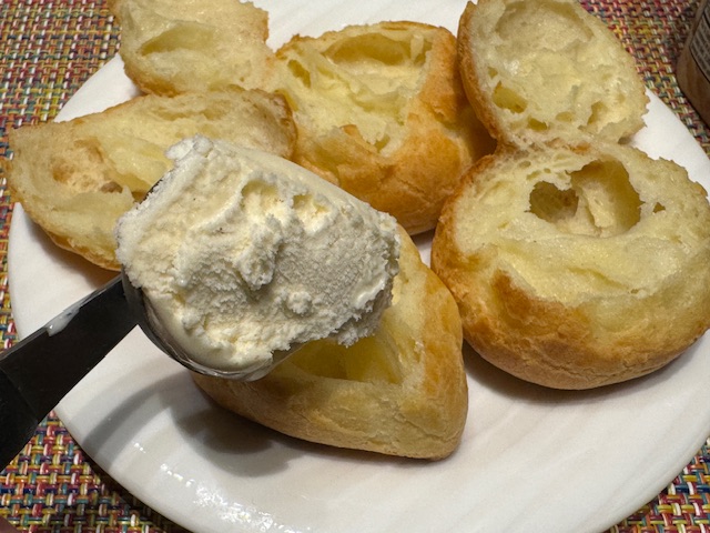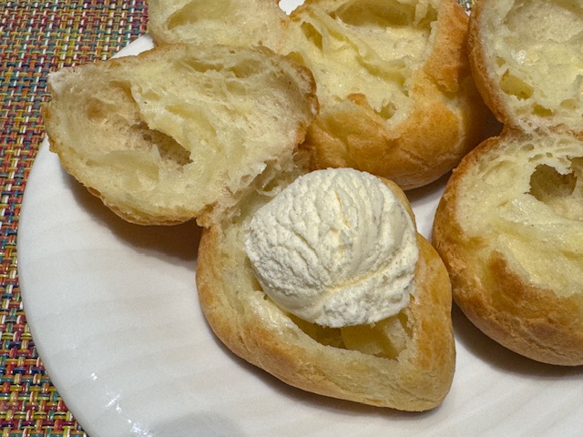 Le menu du Bouillon comprend un « chou chantilly ». Mais je voulais quelque chose un peu plus compliqué. Chez Au Bœuf Couronné, près du Parc de La Villette, ils servent mon menu de rêve — leurs steaks font 250-300 grammes ! — et en dessert, des profiteroles. Je suis déjà grand fan des profiteroles — le dessert de ma première nuit en France. Pour les rendre plus facile, la glace n’est pas maison — mais voici ma glace à la vanille si vous en avez envie.
