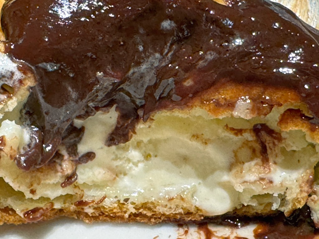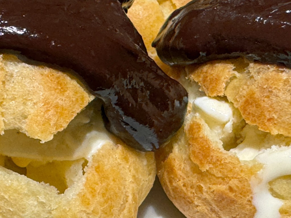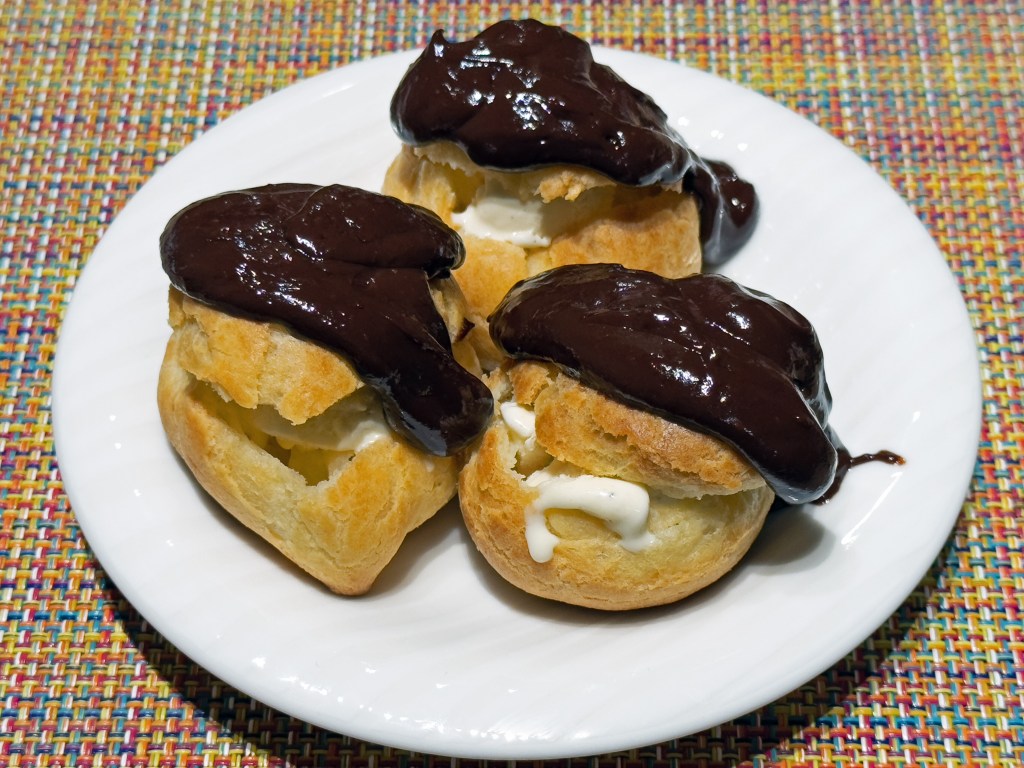 Notre pâte à chou est celle de Gaston Lenôtre, la meilleure que je connaisse et déjà le standard sur ce blog. Vous l’avez vue plusieurs fois ici. La sauce au chocolat est similaire à celle de Hervé Cuisine — d’autres recettes ajoutent du beurre, comme si c’était une ganache pour macarons. J’ai fait une plus petite quantité que dans les instructions ; mes quantités en bas suffiront pour les 16 choux des photos.