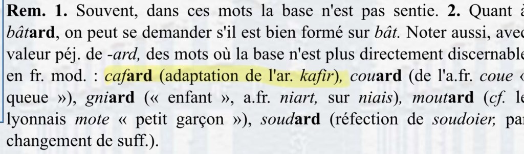 En premier, c’est donc péjoratif, et il y a plein d’exemples qui va avec : bâtard, béquillard, pantouflard, etc. Le Trésor signale en plus que la base n’est plus toujours évidente : « cafard », par exemple, part du mot arabique « kafir » C’est un infidèle, ça !