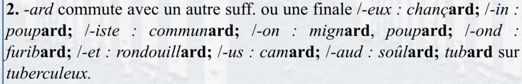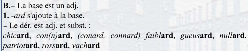 Honnêtement, en quelque sorte j’ai raté que « -ard » est productif. On le trouve dans un gentilé — savoyard — et il y a « vieillard » et « clochard », mais de tout ça, j’en tire au pire que « -ard » veut dire « un type qui est quel qui arrive devant le suffixe ». Et c’est un peu ça, mais il faut le gérer soigneusement. Le Trésor nous dit tout d’abord :