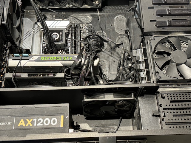 D’abord, faisons brièvement le tour de l’ancien truc. Il y a plein d’espace partout, dont assez pour jusqu’à 4 lecteurs de DVD ou Blu-Ray si j’en voulais. (Un me suffisait.) L’alimentation est plus qu’assez — jusqu’à 1200 watts. Le truc dans la dernière photo est un refroidisseur pour processeur liquide — sans lumières stupides. Je n’ai plus 15 ans, et je suis un professionnel, merci. (On devrait expliquer ça aux manufactures.)