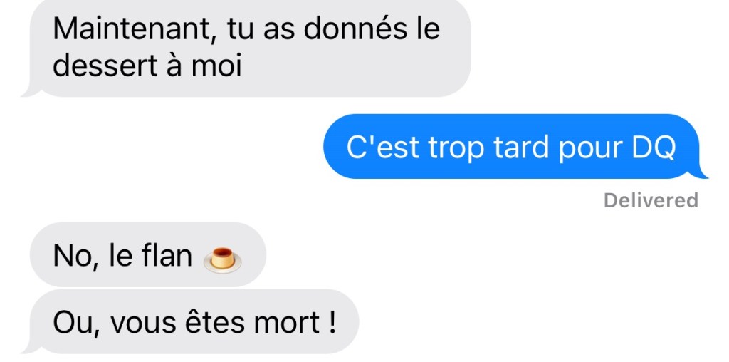 Je suis ravi de vous montrer les progrès de La Fille en français. Elle a du travail à faire quant aux conjugaisons, mais vous n’aurez aucun problème à comprendre ce qu’elle veut dire :