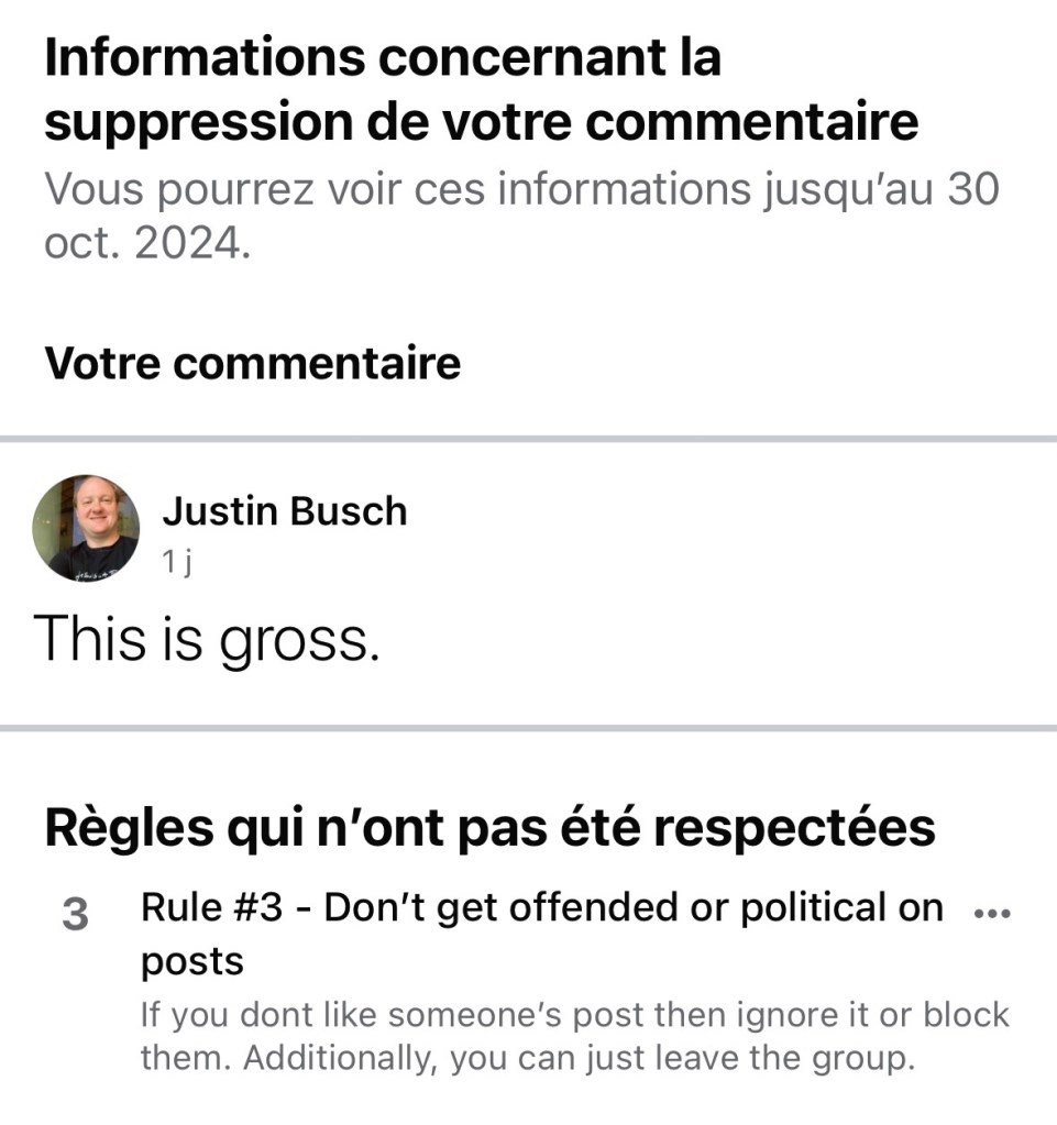 Vous pouvez voir mon commentaire en anglais. Ça dit simplement « C’est grossier. » La règle que je n’ai pas respectée ? « Ne sois pas offensé. » L’explication en bas ajoute « Si tu n’aimes pas le post de quelqu’un, bloque-le. En plus, tu peux quitter le groupe. » (Rappelez que selon moi, « you » en anglais se traduit seulement par « tu ».)