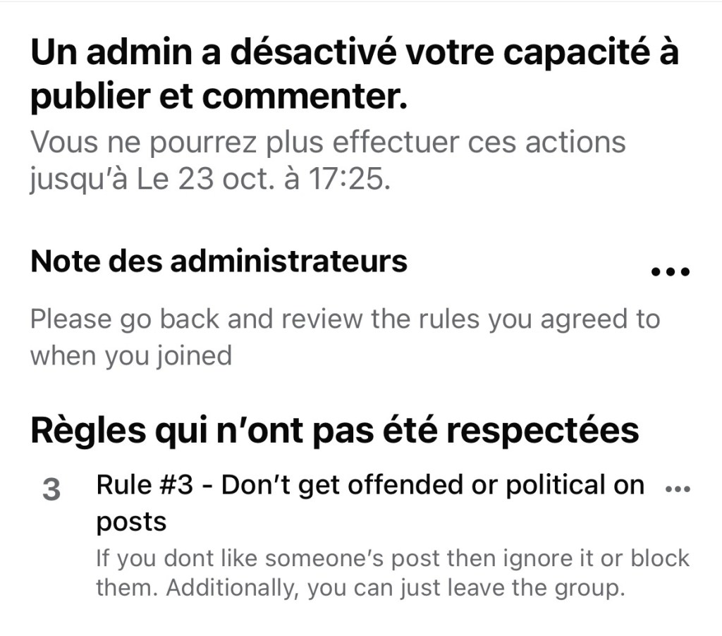 Il y a deux jours, pour la première fois, j’ai réussi à me faire bannir d’un groupe sur Facebook.