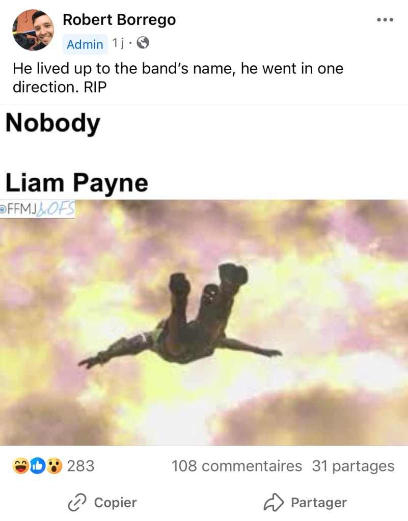 C’était dans un groupe anglophone consacré à des blagues autour de la série de jeux vidéo Final Fantasy. Peut-être que vous avez entendu parler de la mort du chanteur Liam Payne, anciennement du groupe One Direction, qui est tombé du balcon de sa chambre d’hôtel. Il est possible qu’il se soit suicidé. Moins d’une heure après la nouvelle, l’admin du groupe a posté cette photo du personnage Tidus de Final Fantasy X, de la finale du jeu (c’est un moment tragique). La légende en anglais dit, « Il s’est montré digne du nom de son groupe, il est allé vers une direction. »