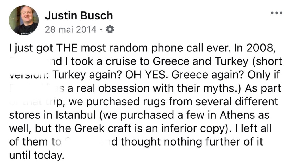 Je viens de recevoir l’appel le plus inattendu de tous les temps. En 2008, mon ex et moi avons fait une croisière en Grèce et en Turquie…Pendant le voyage, nous avons acheté des tapis de plusieurs magasins à Istanbul (à Athènes aussi, mais la version grecque est une copie inférieure).