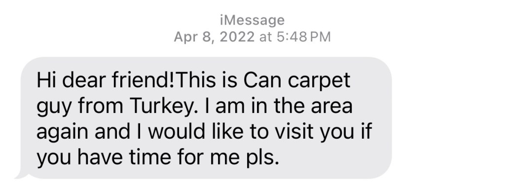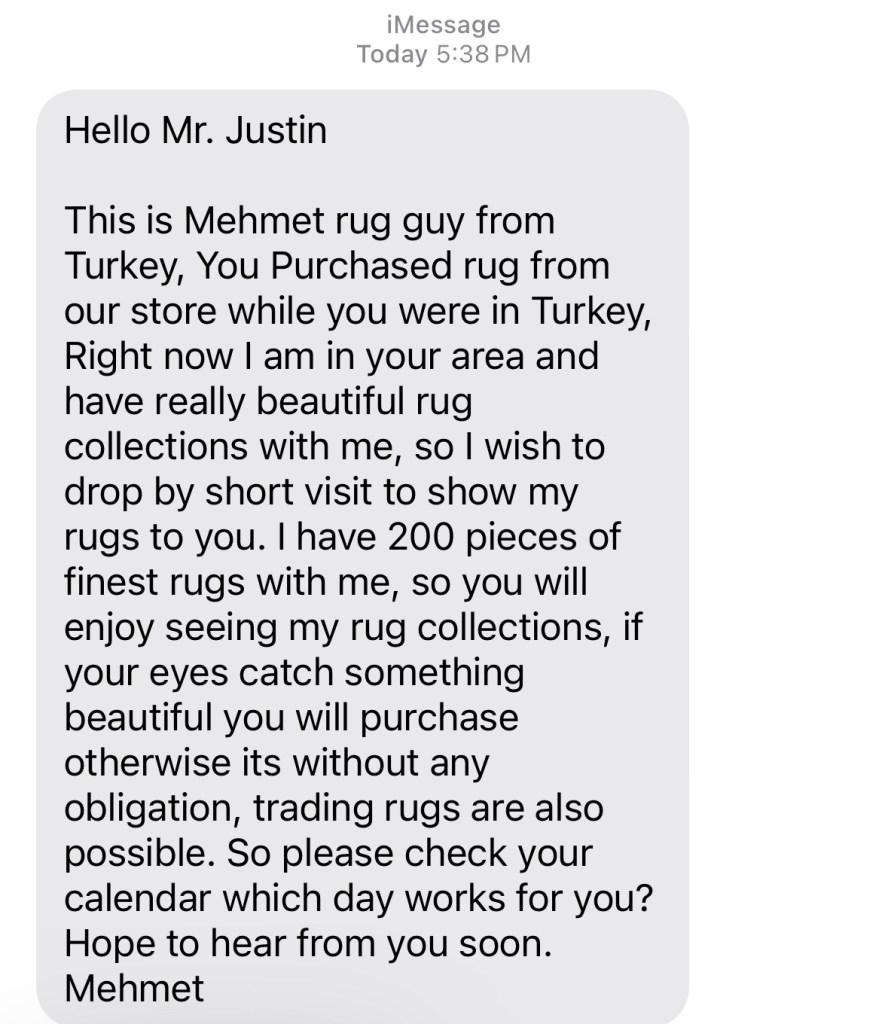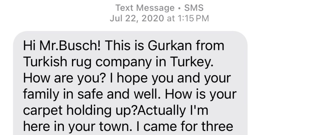 Qu’est-ce qui disait le SMS ? « Bonjour Justin, je suis Mehmet le vendeur de tapis. Tu en avais acheté un dans mon magasin en Turquie. Je suis dans ta région et aimerais te rendre visite avec notre collection. » Certains détails ont changé depuis ce temps-là. Pour une chose, il ne s’appelle Mehmet à chaque fois. En 2020, il s’appelait Gurkan :