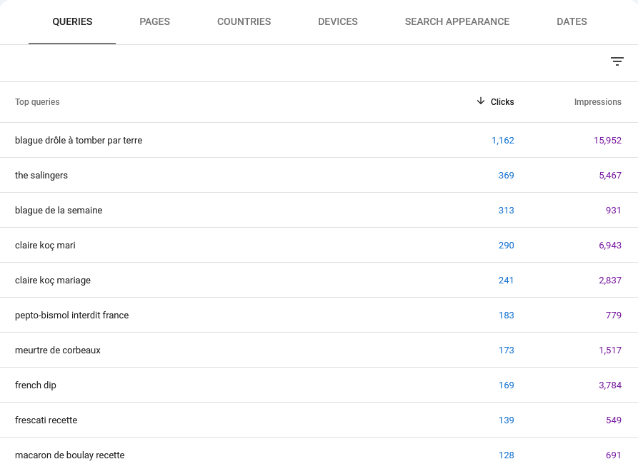 Des top 20 recherches, il y en a 4 sur la vie personnelle de Claire Koç et son mari, et une sur « Jeanne Added vie privée », alors que les brouteurs sont tombés en 20e place. Bien sûr, je suis ravi que les blagues soient devenues une destination importante pour les internautes, mais mes articles sur les femmes nommées sont strictement sur leur travail. Je suis heureux de voir que certaines recettes obscures ont attiré de l’attention, le frescati et les macarons de Boulay, mais je trouve cette tendance écœurante. En plus, si je vais être lié avec une chanteuse comme ça, elle sera Julie Zenatti, Véronique Sanson, ou personne. Non, mais je n’écris pas sur elles de cette façon non plus.