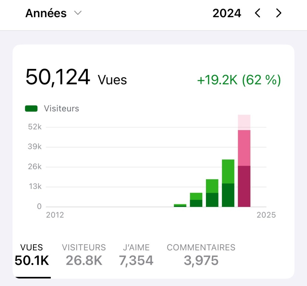 Commençons avec mon obsession, le trafic, auquel il faut mettre un stop dans les Caraïbes. (Désolé, je suis incorrigible — mais je l’assume.) Au début de chaque année, j’aime estimer ce que je considèrerais une bonne année, ou encore plus, une année de rêve. Ayant terminé 2023 avec 30 966 vues sur 15 309 visites, j’ai décidé qu’une bonne année serait 42 000 vues sur 20 000 visites, et une année de rêve serait 50 000 vues sur 25 000 visites. Avec 49 900 vues sur 26 700 visites pour commencer le dernier jour de l’année, j’ai fini avec 50 124 vues sur 26 826 visites. Je vous remercie tous pour ça.