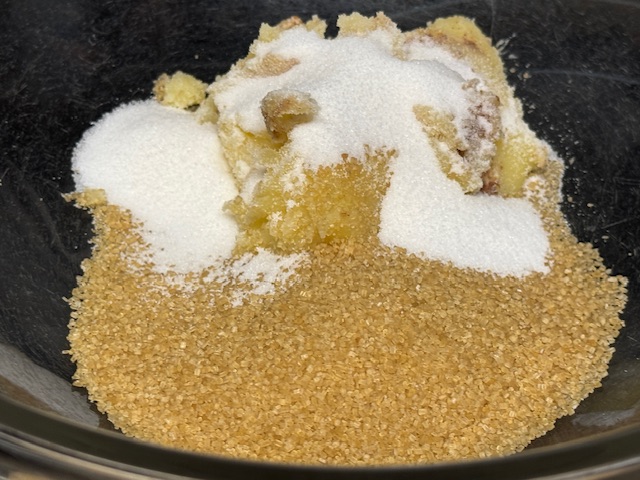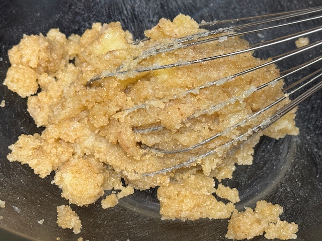 1. Une heure plus tard, mettre le beurre noisette dans un saladier avec la cassonade et le sucre en poudre. Fouetter bien.