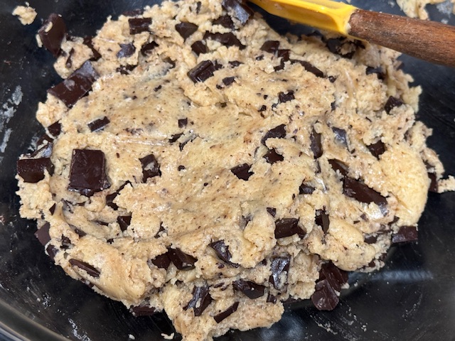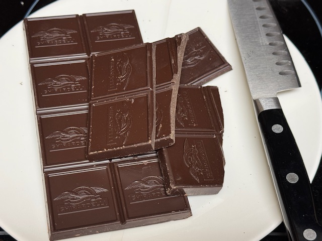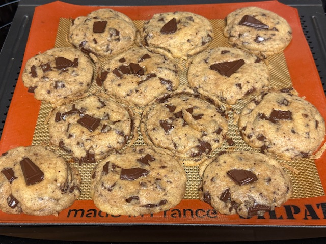 Péla est grand fan des chocolats noirs pâtissiers dans ses cookies. D’habitude, j’utilise Ghirardelli 60 % noir, ce qui a un bon rapport qualité prix. Mais cette fois, à mes goûts c’était un peu trop amer ; j’aimerais essayer peut-être soit un chocolat moins noir comme Valrhona Équatoriale 55 % soit un chocolat avec un profil plus sucré comme Valrhona Dulcey. En revanche, selon la cliente pour cette commande, La Fille, ce sont le top et la moitié du lot a déjà disparu.