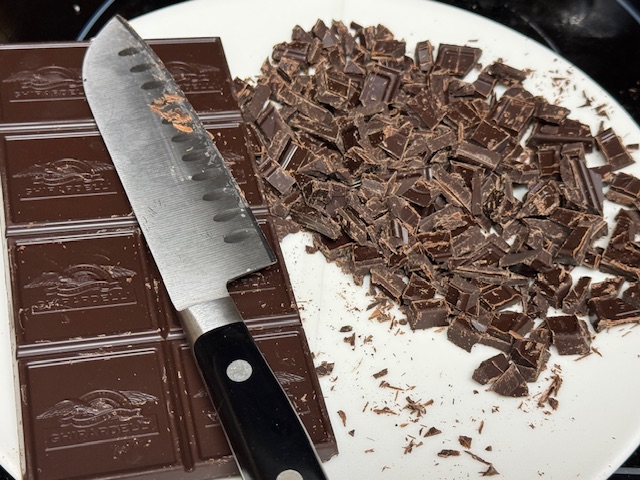 1. Hacher finement le chocolat noir pâtissier avec un couteau sans dents. Réserver 12 des plus gros morceaux et ajouter le reste à la pâte. Mélanger bien.