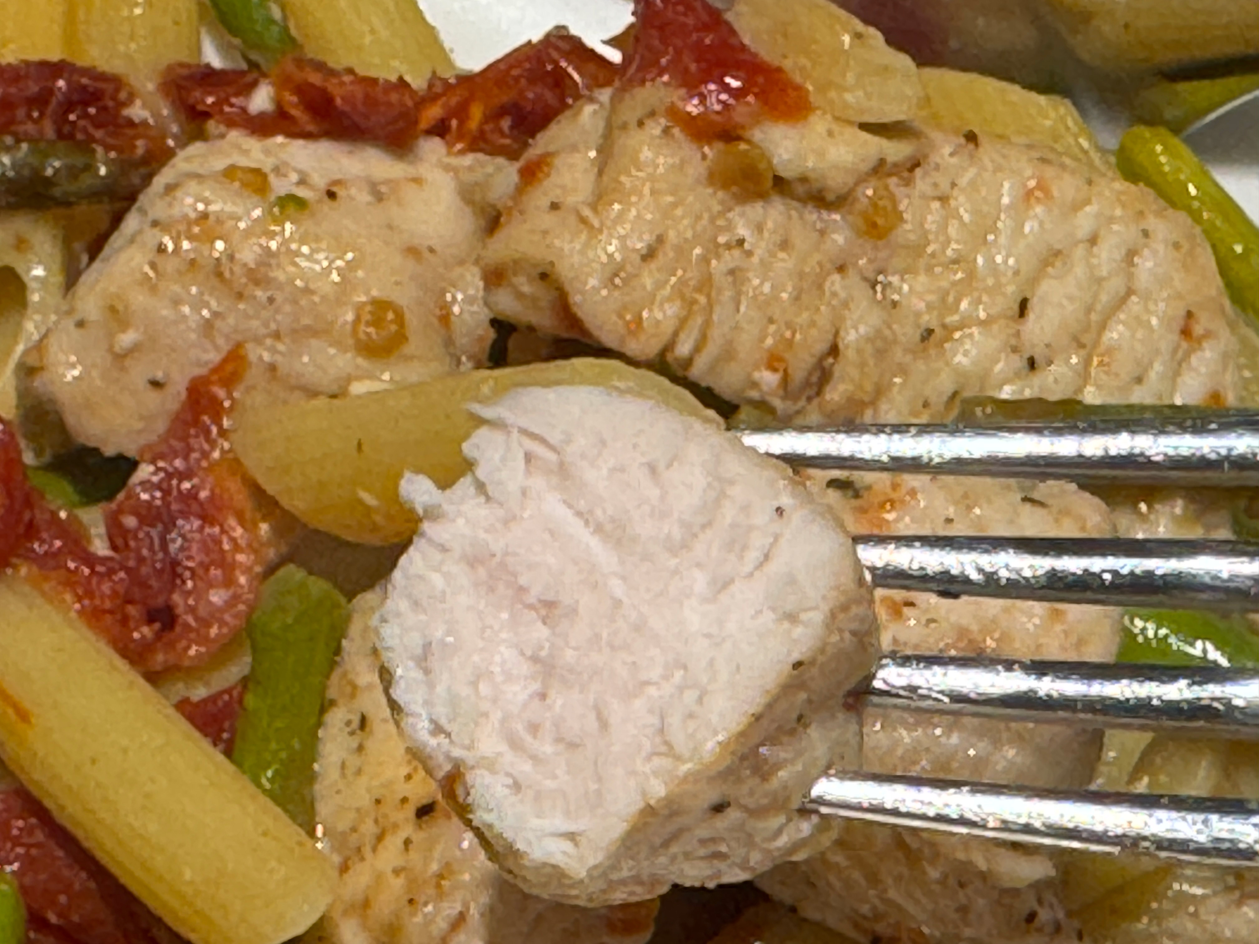 1. Égoutter les pâtes, les ajouter au poulet et mélanger. C’est tout !