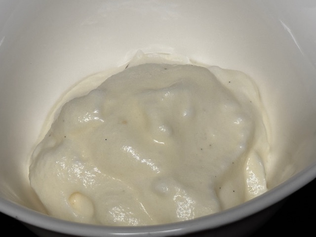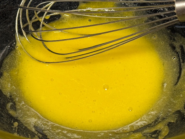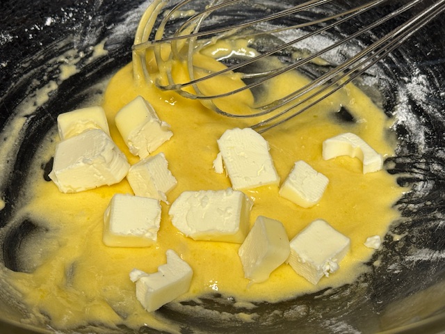 - Couper le beurre en dès et les ajouter au saladier. Verser le lait chaud (en retirant la gousse) sur le tout et bien mélanger jussu’à ce que le tout soit homogène.