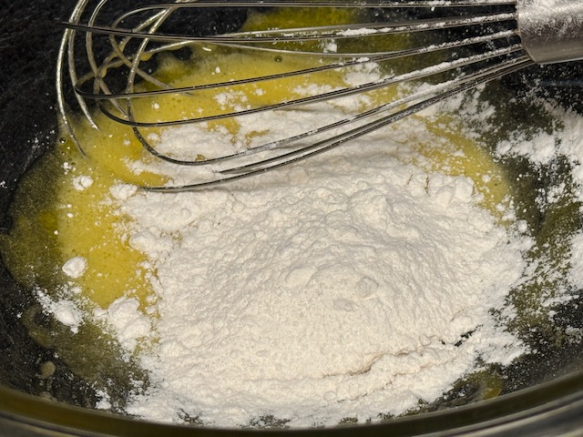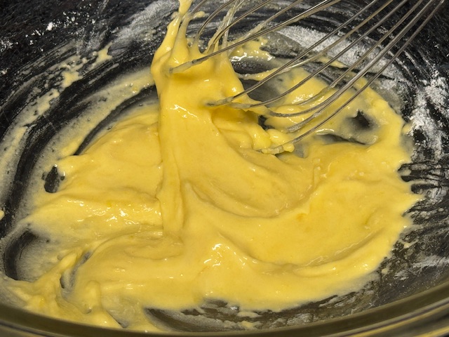 - Pendant ce temps-là, dans un saladier, verser les jaunes et les 25 grammes de sucre. Fouetter bien. Ajouter la farine et fouetter plus.
