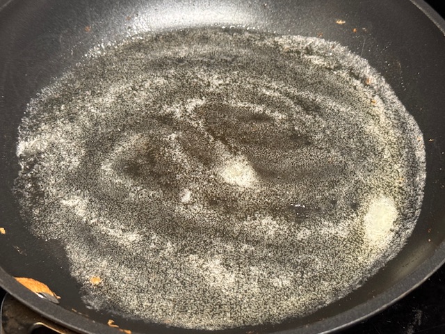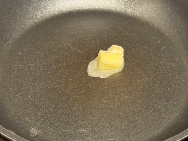 - Commencer à faire chauffer une petite poêle sur un feu moyen. La mienne fait 20 cm de large, mais j’ai évité les bords pour ce qui suit, pour une taille d’environ 15 cm la crêpe.