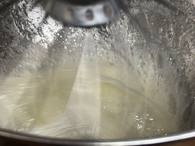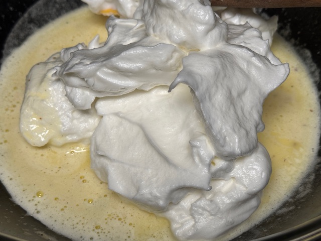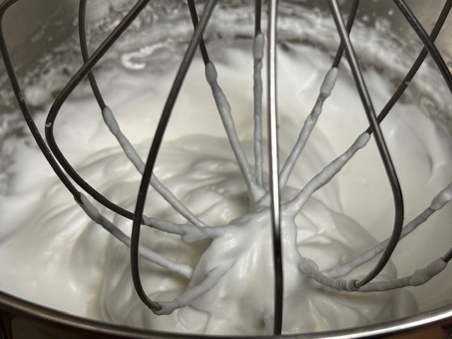 - Verser les blancs dans le saladier et mélanger avec une maryse. Cependant ! Dans cette vidéo sur Instagram, Mme Heitzler utilise plutôt un fouet et obtient une pâte plus lisse que la mienne. La prochaine fois, je ferais pareil. J’avais peur que ça produise une pâte pas assez aérée.