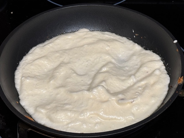 - Dès que la 4e petite crêpe va dans le four, commencer à faire chauffer une grande crêpière sur un feu moyen (le mien était trop chaud). Ma poêle pour cette partie fait 28 cm. Le beurrer juste avant d’y verser la pâte. Enfourner pendant seulement 3 minutes.