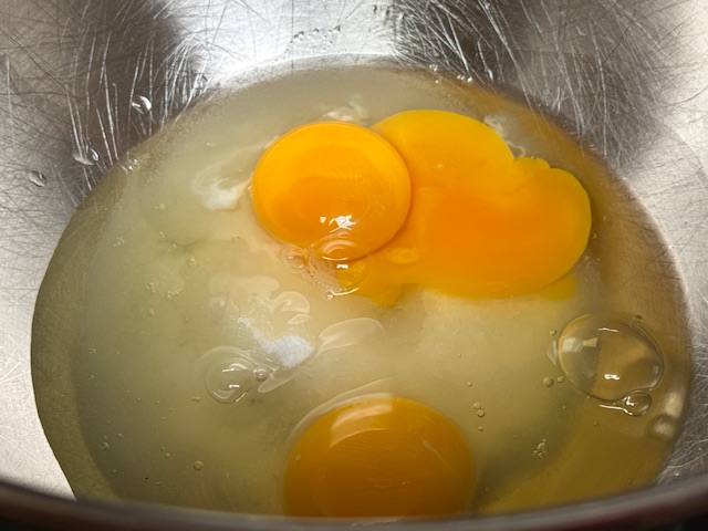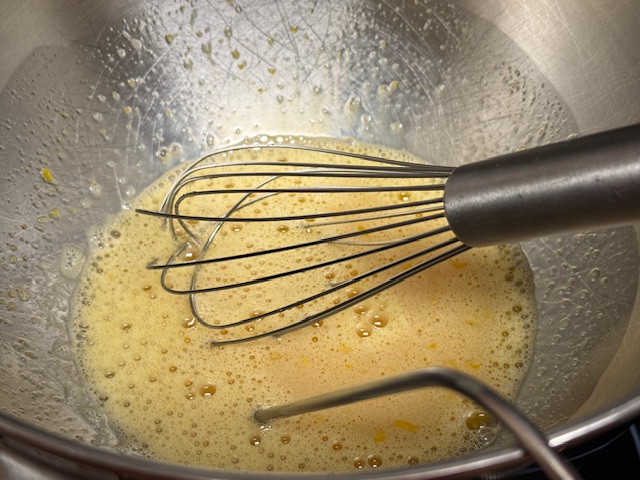 - Dans le bol du robot, déposer les œufs et le sucre. Commencer à fouetter sur la casserole jusqu’à ce que la température atteigne 55° C.