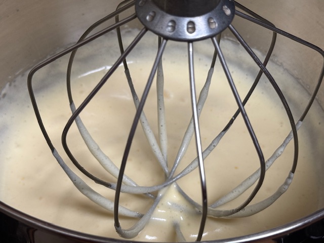 - Retirer le bol du bain-marie et le mettre dans le robot. Fouetter avec le robot jusqu’à ce que la température a baissé à la température ambiante et le volume a triplé.