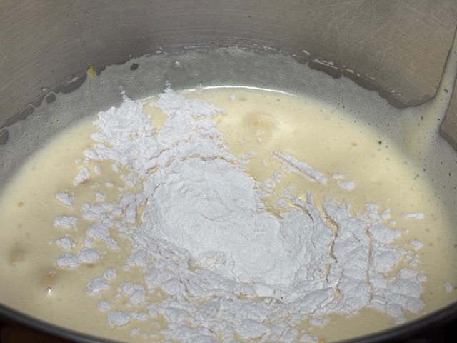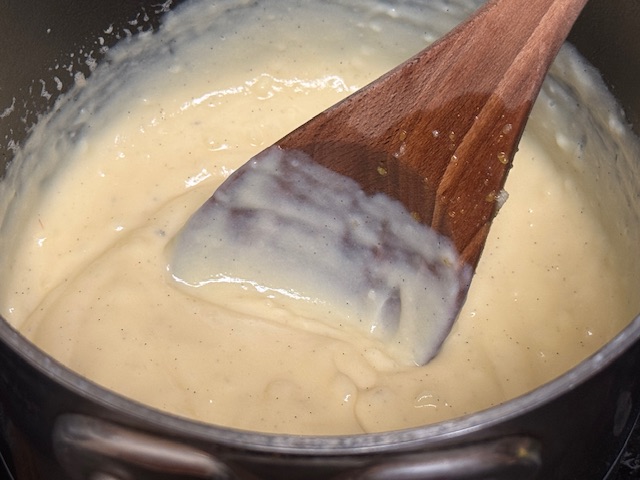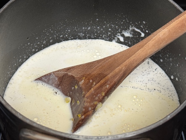 - Verser 1/3 du lait chaud sur les œufs. Fouetter pour tout mélanger, puis verser dans la casserole avec le reste du lait. Baisser le feu à moyen-doux. Remuer jusqu’à ce que la crème devienne épaisse.