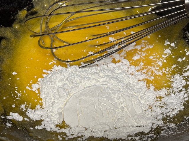 - Mettre une cuillère des œufs dans le bol du beurre. Avec une maryse, commencer à replier la farine dans les œufs. Faites ça en deux tranches, pas toute la farine en même temps. Ajouter le beurre et replier à la maryse.